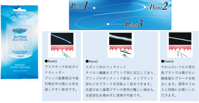 - スーパーフロスは、ブリッジ(Br)やインプラント(Ip)、矯正器具が口腔内にある方へおすすめです。通常のフロスでは清掃しにくい部分に適してます。