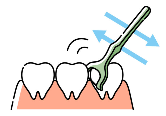 - 使用方法は、ノコギリのように横にギコギコ動かして歯間部まで挿入し歯垢を除去します。