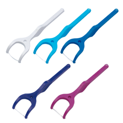 - みなさんがよく目にするタイプのフロスはF字型が多いかと思います。このフロスは持ち手がついており、前歯部の清掃に適しています。ただし臼歯部を行う時、頬が邪魔になり難しいと言われる方も良くおられます。