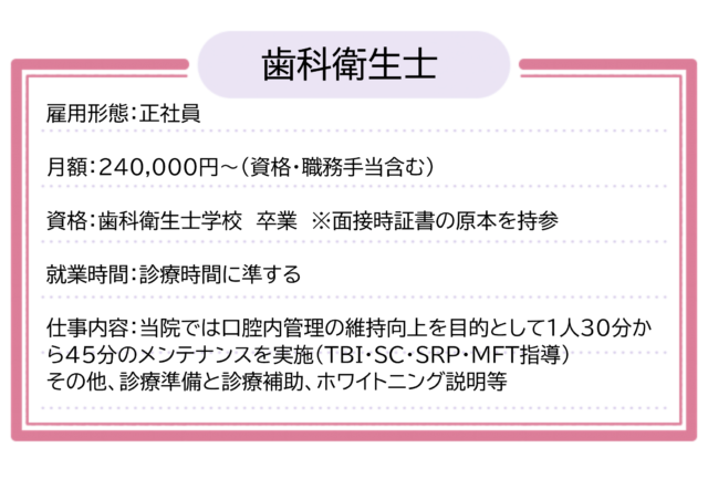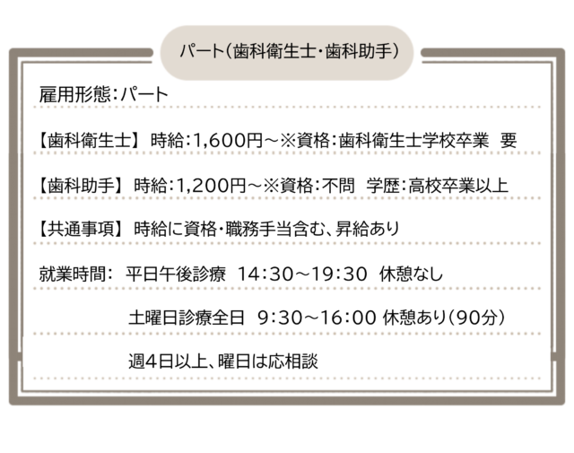 職種は【歯科助手】と【歯科衛生士】、パートと正社員募集です。