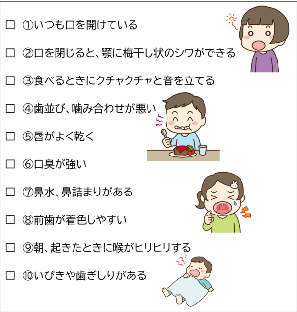 10項目あるうち、1つでも当てはまるものがあったら口呼吸を疑ってください。
